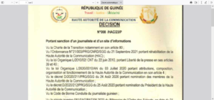 Dans une décision dont une copie a été transmise à notre Rédaction, la Haute Autorité de la Communication (HAC) a suspendu le site d’informations www.depecheguinee.com et le journaliste Abdoul Latif Diallo pour « non recoupement d’informations. Ladite décision prise ce lundi 11 septembre 2023 indique que la période de cette sanction est d’un mois.