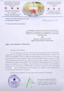 Dans une correspondance émouvante adressée au légendaire champion du monde de boxe Francis Nganou, après sa brillante prestation contre le boxeur britannique Tyson Fury à Ryad, en Arabie Saoudite, l’association des princes et des notables des chefferies du Cameroun(GCPN CAM) magnifie la grandeur du jeune camerounais, loue sa détermination à réussir et lui gratifie une prolifération de bénédictions divines et ancestrales afin qu’il dompte le monde de la boxe internationale dans les prochains mois ou les prochaines années.