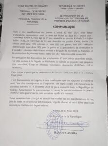 Une situation qui a amené le procureur de la République, près le Tribunal de première instance de Kindia, Me Damou Camara à faire un communiqué hier mercredi 13 mars 2024 dont voici la teneur