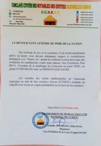 Les notables des entités traditionnelles du Cameroun regroupés au sein de leur conclave citoyen (CCNETC) souhaite un indicible bon retour au couple présidentiel sur la terre de nos ancêtres.