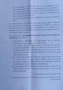 Selon les informations recueillies par ces organisations auprès de l’hôpital régional de N’Zérékoré, des supporters présents au stade, ainsi que des chefs de quartiers, il est estimé que la majorité des victimes sont des enfants de moins de 18 ans. Les déclarations des organisations soulignent également les nombreux blessés et les dégâts matériels importants causés par cet événement tragique.