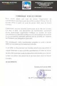 “Nous avons appris par voie de presse l’organisation de manifestations pacifiques par des entités se disant Forces Vives de Guinée (FVG) à partir du lundi 06 janvier 2025, dans le Grand Conakry.
