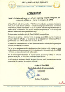 À l’approche des échéances électorales, la Haute Autorité de la Communication (HAC) poursuit l’organisation de la campagne médiatique. Dans un communiqué rendu public ce samedi 25 avril 2026, l’institution annonce la tenue, le lundi prochain, du tirage au sort déterminant l’ordre de passage des partis politiques et mouvements politiques sur la Radio Télévision Guinéenne.